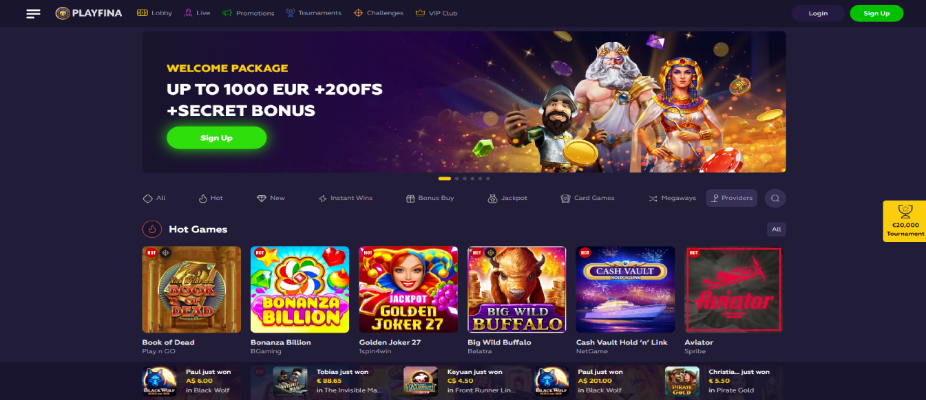 More than 11,000 slots, all varieties of blackjack, dozens of roulette games, craps, video poker, and other games are available to you at Playfina casino online Discover the Excitement Awaiting at Playfina Online Casino, Where Adventure Awaits!! Play the Best Online Casino Games at Playfina ✓ Try Slots, Blackjack, Roulette, Craps and Video Poker with Huge Bonuses. Playfina Casino How to Start Up to 1000€ + 200 FS + Secret Bonus... Playfina Casino - Bonus Codes – 50 Free Spins!