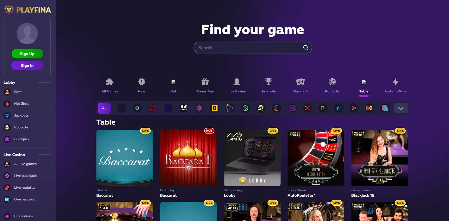 More than 11,000 slots, all varieties of blackjack, dozens of roulette games, craps, video poker, and other games are available to you at Playfina casino online Playfina - Embracing Gamers of All Skill Levels and Transforming Beginners into Pros! Play the Best Online Casino Games at Playfina ✓ Try Slots, Blackjack, Roulette, Craps and Video Poker with Huge Bonuses. Playfina Casino How to Start Up to 1000€ + 200 FS + Secret Bonus... Playfina Casino - Bonus Codes – 50 Free Spins!